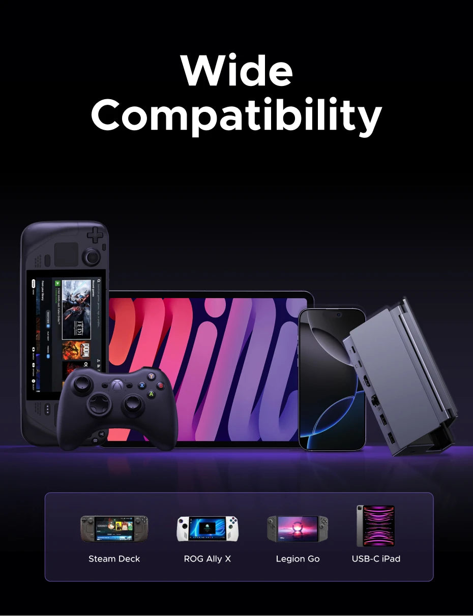 Die USB-C-Hub Dockingstation für das Steam Deck bietet vielseitige Anschlussmöglichkeiten an nur einem Port. Sie können Monitore, USB-Laufwerke, Tastaturen, Ladegeräte und weiteres Zubehör gleichzeitig nutzen – ideal für Gaming, Homeoffice oder unterwegs