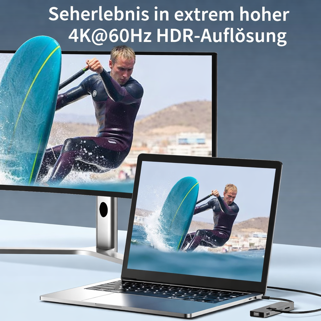 Dank des 4K-HDMI-Anschlusses können Sie Inhalte in gestochen scharfer Auflösung auf externen Monitoren oder Fernsehern darstellen. Perfekt für Präsentationen, Streaming oder kreative Arbeit, sorgt der Hub für eine stabile Verbindung und brillante Bildqualität bei Video, Fotos und Gaming.