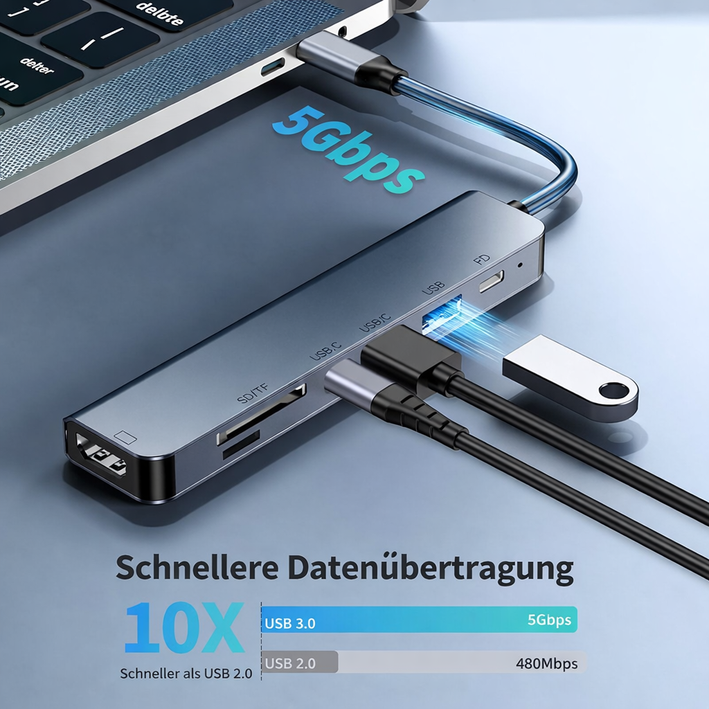 Der USB-C-Hub ermöglicht die gleichzeitige Nutzung mehrerer Geräte über einen einzigen Anschluss. Schließen Sie Monitore, USB-Laufwerke, Tastaturen, Ladegeräte und weiteres Zubehör gleichzeitig an – ideal für Homeoffice, Multimedia-Setups oder unterwegs. So sparen Sie Zeit, Kabelsalat und verbessern Ihre Produktivität.